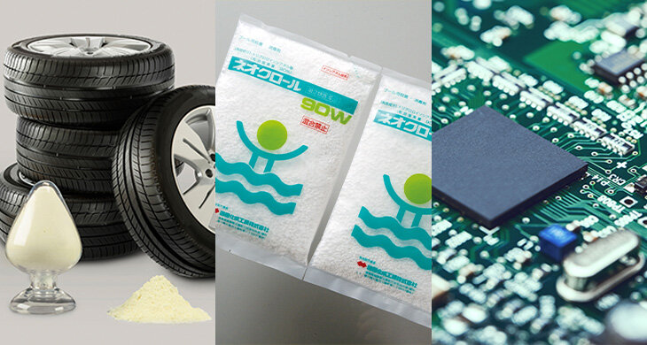 四国化成工業の創業は1947年。きっかけとなったのは化学繊維レーヨンやセロハンの製造工程で用いられる「二硫化炭素」の製造に成功したことです。1957年には洗剤や入浴剤として利用される「中性無水芒硝」の製造を開始しました。